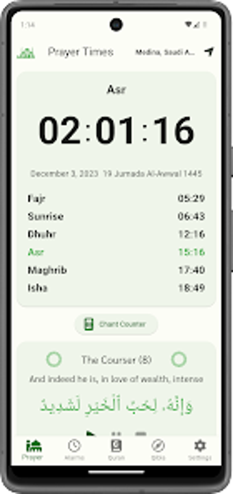 Prayer Times Qibla Quran is een veelzijdige applicatie die gebruikers helpt om op de hoogte te blijven van gebedstijden, de Quran te lezen en te luisteren, en de Qibla-richting te bepalen. De app biedt een gebruiksvriendelijke interface waarmee gebruikers eenvoudig dagelijkse gebedstijden kunnen volgen, inclusief een countdown-timer en tijdige meldingen, zodat ze geen gebed missen. Daarnaast kunnen gebruikers hun meldingen aanpassen aan hun voorkeuren.